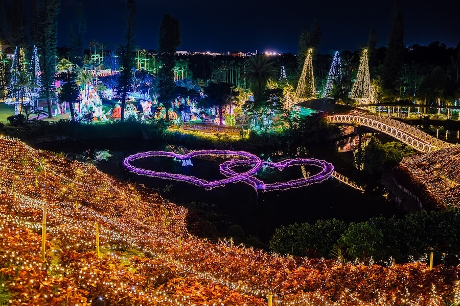 Award-winning Okinawa illumination event with handmade lights, dinner buffet, and bird show at Southeast Botanical Gardens.