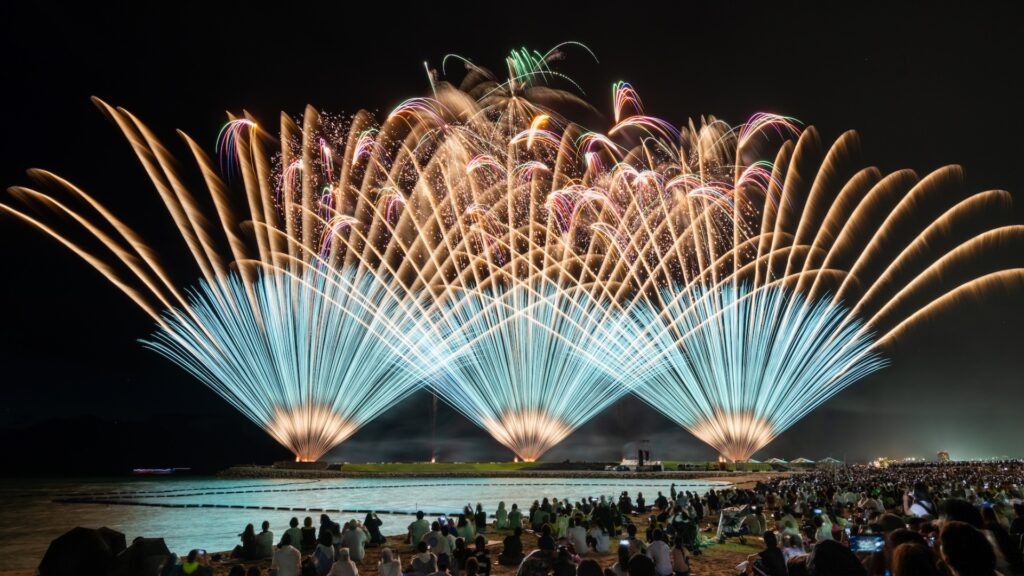 One of the festival’s highlights is the Design Fireworks, curated by the world-renowned designer Junko Koshino. Having started in 2010, this segment of the festival has evolved over the years, with 2024 marking its 15th installment. Koshino’s fireworks are a blend of art and technology, with each firework meticulously designed and synchronized to music, painting the night sky with a kaleidoscope of colors and patterns.