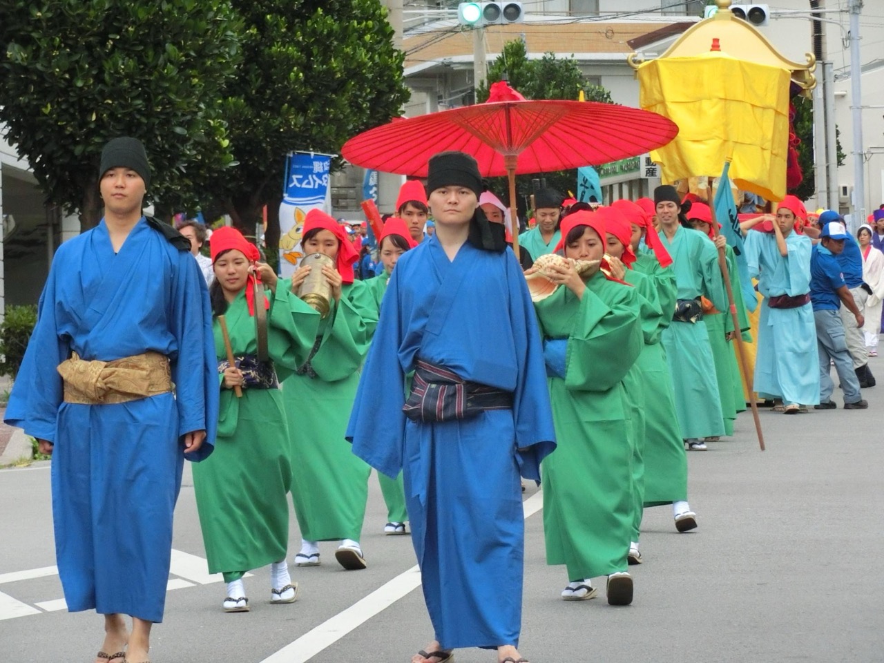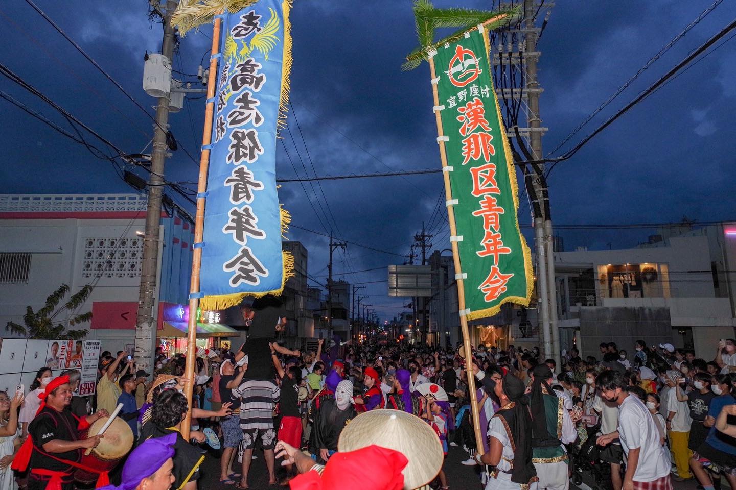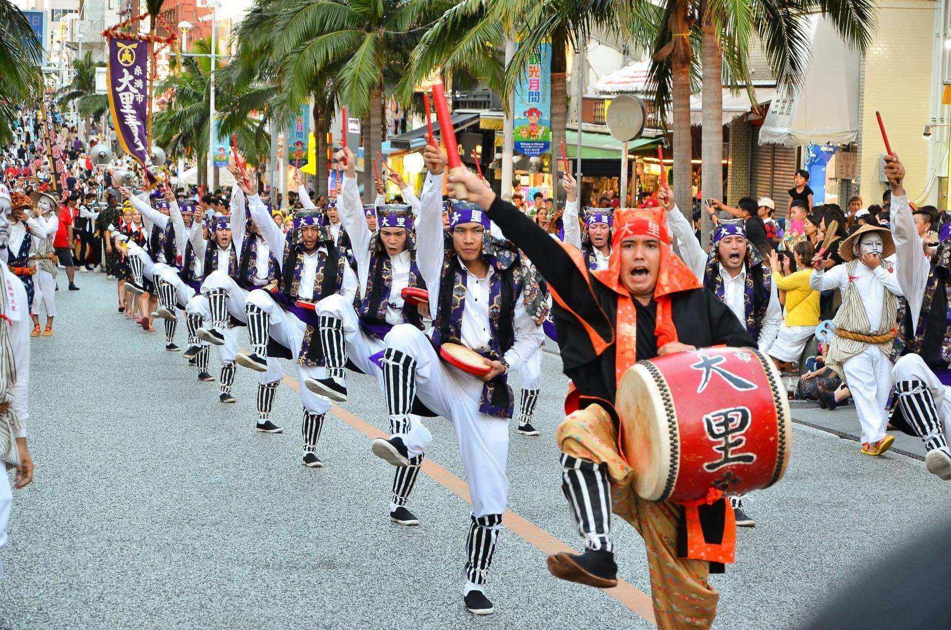 Traditional Okinawan street festival with Eisa parade, food, and games where locals turn the street…